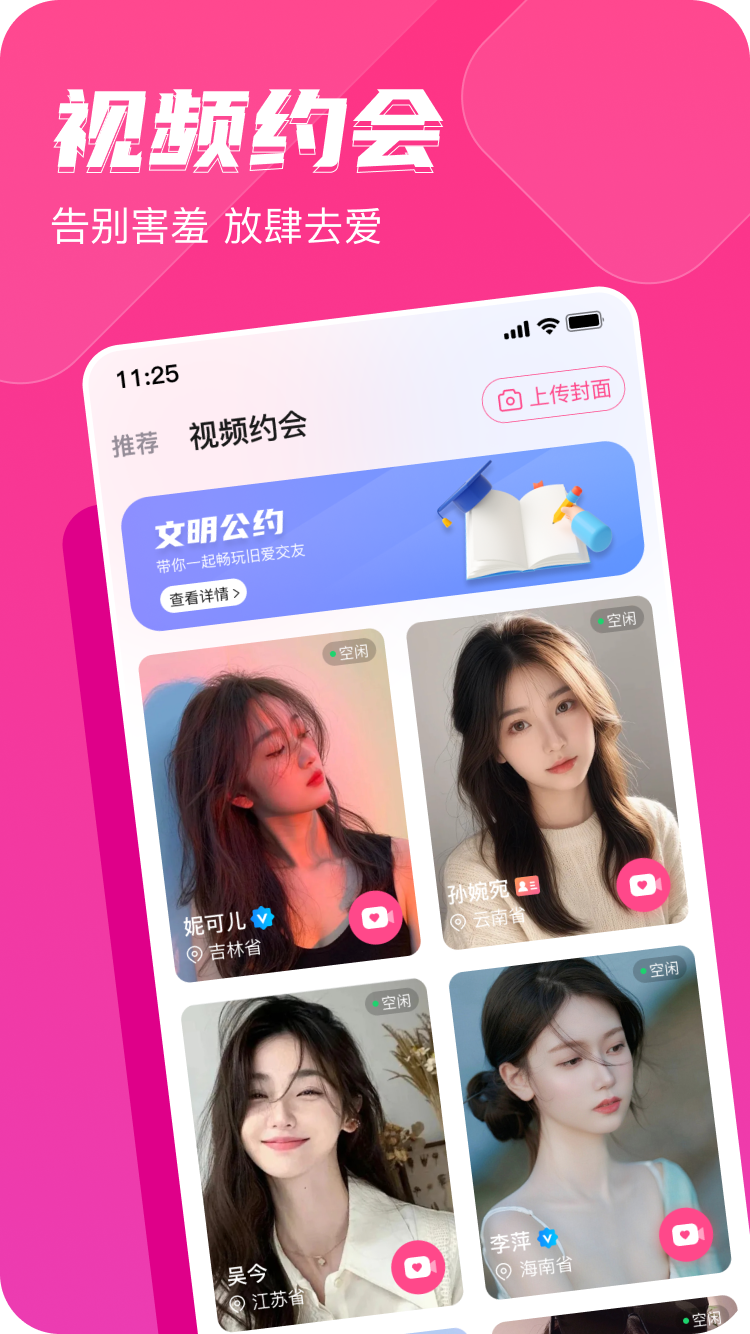 视频约会让你体验全新的交友体验,先视频再聊天,选一个喜欢的人聊起来也舒服。