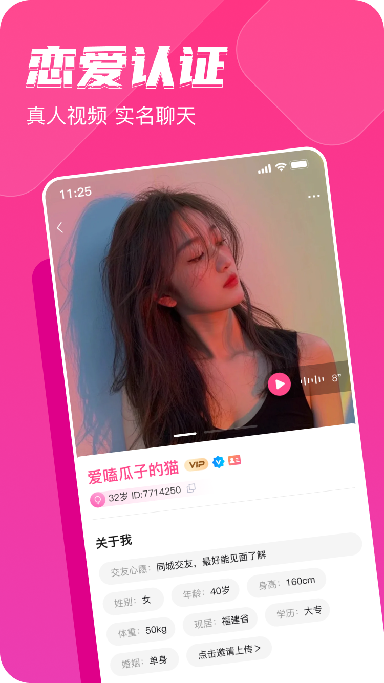 【视频约会】:支持先视频看真人,通过视频约会来建立双方的首次见面,有可能会一见钟情哟。