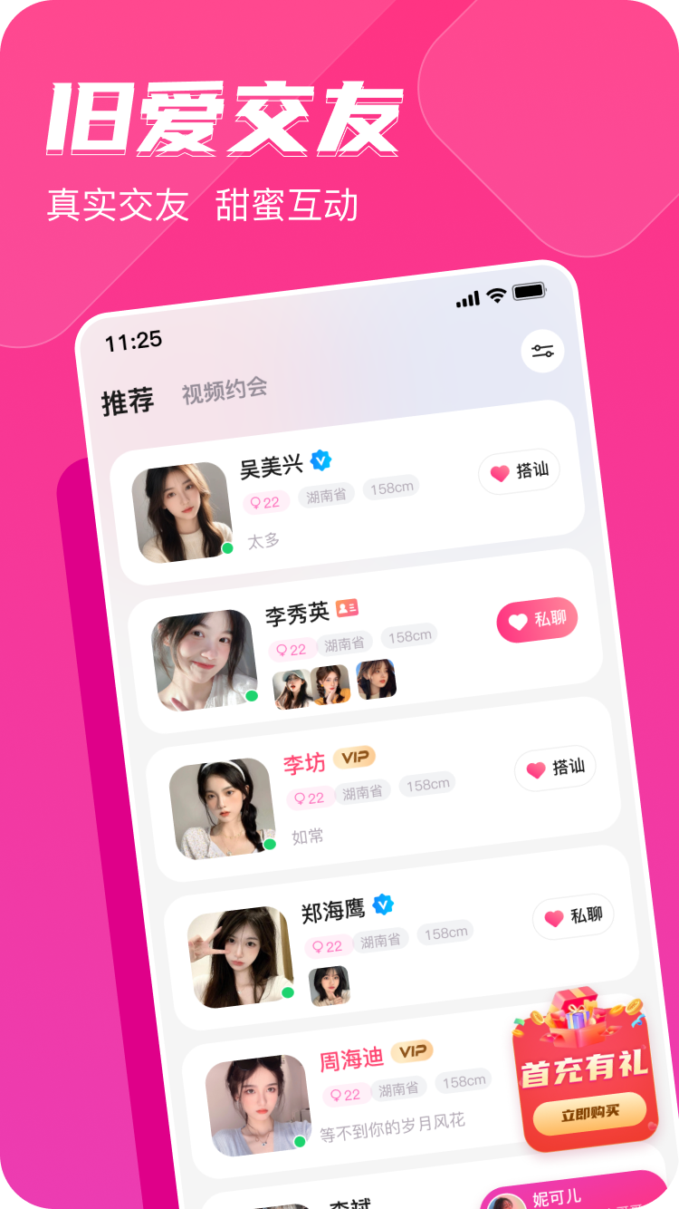旧爱是一款全新的视频交友平台,包含了文字聊天,视频聊天等功能。